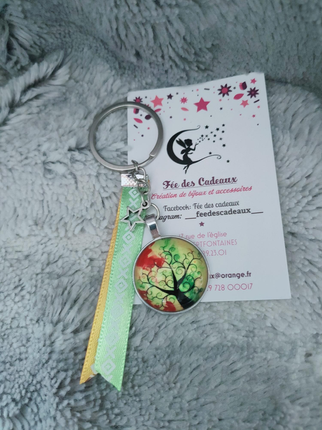Porte clés à chaînette motif Arbre de Vie travaillé sous un cabochon en verre de 25mm accompagné d'une breloque Étoile Ciselée et de rubans satin aux couleurs assorties...